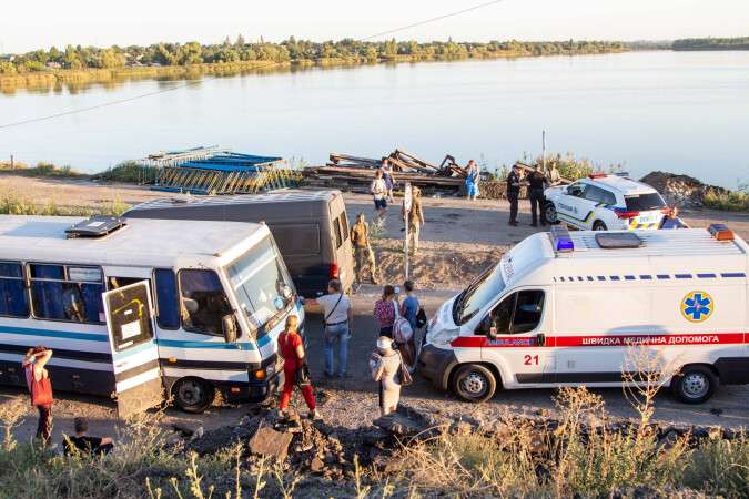 Инцидент произошел вчера, 31 августа. Рейсовый автобус, который двигался из Никополя на Херсон переехал временную переправу, но в момент выезда на противоположный берег съехал с приваренного к ней "пандуса". Автобус резко качнуло вправо, люди внутри падали, бились головами о стекла и другие твердые предметы. В результате восемь человек получили травмы, одного из них госпитализировали в больницу города Покров. Автобус своим ходом выехал из ловушки.