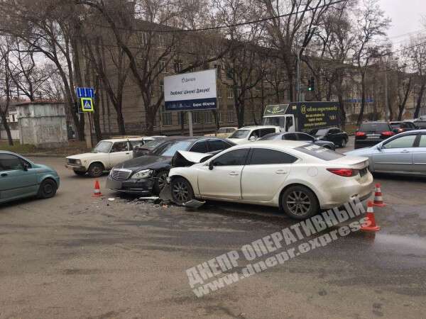 В Днепре легковой автомобиль Mazda врезался в легковой автомобиль Mercedes, выполнявший маневр поворота налево: из-за аварии образовалась пробка - сообщает "Днепр оперативный" с места событий.