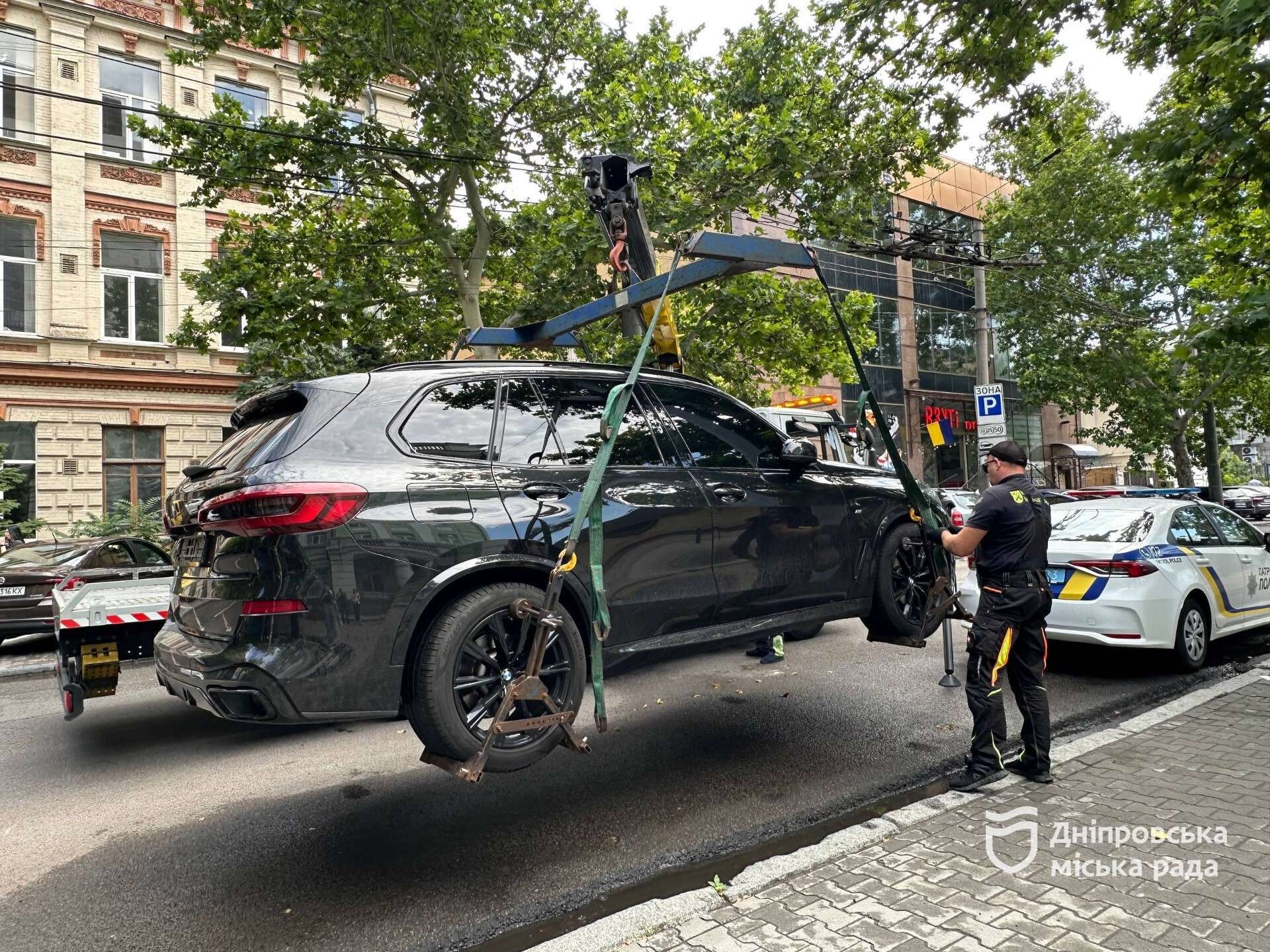 Транспорт без номерных знаков и оплаты за парковку эвакуируется. На водителя налагается штраф в соответствии с Кодексом Украины об административных правонарушениях.