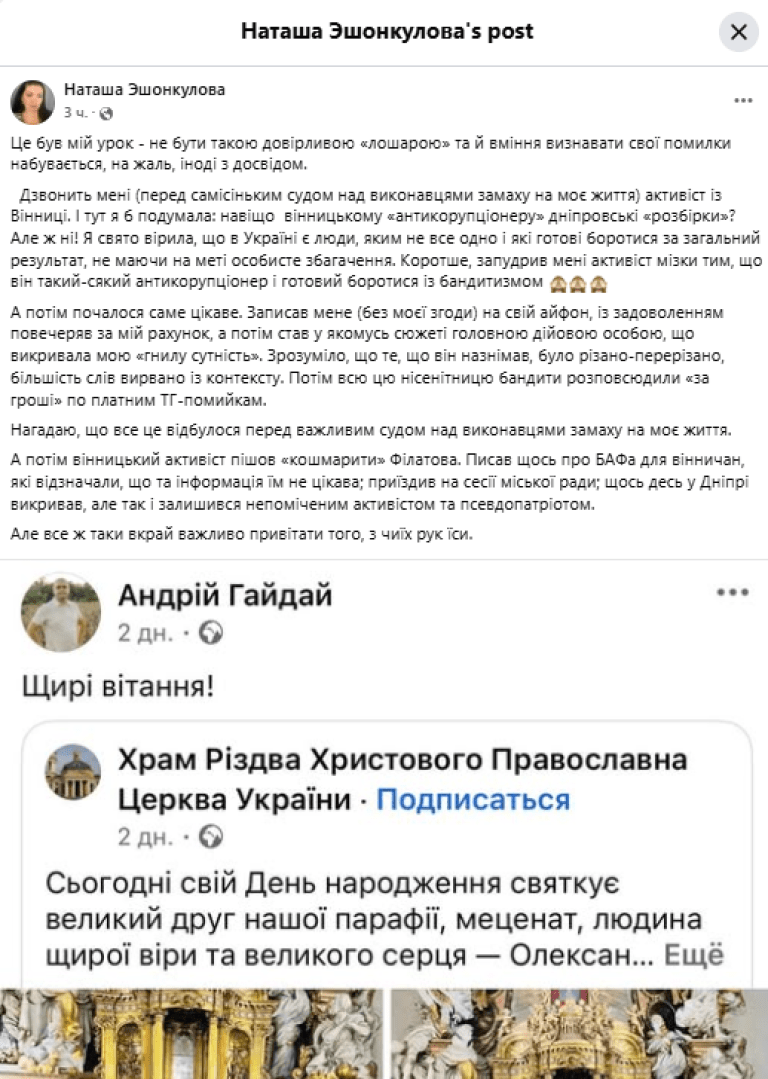 Я свято верила, что в Украине есть люди, которым не всё равно и которые готовы бороться за общий результат, не ставя своей целью личное обогащение. Короче, заморочил мне активист голову тем, что он такой-сякой антикоррупционер и готов бороться с бандитизмом. А потом началось самое интересное. Записал меня (без моего согласия) на свой айфон, с удовольствием поужинал за мой счёт, а потом стал в каком-то сюжете главным разоблачителем моей «гнилой сущности». Понятно, что то, что он наснимал, было нарезано и перемонтировано, большинство слов — вырваны из контекста. Потом весь этот бред бандиты распространили «за деньги» по платным телеграм-помойкам, — рассказала активистка.