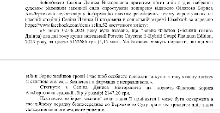 «Суд признал недостоверными сведения, распространенные 02.06.2023 г. Денисом Селиными в Facebook про якобы покупку Борисом Филатовым автомобиля Porsche вовремя войны», — указано в решении.