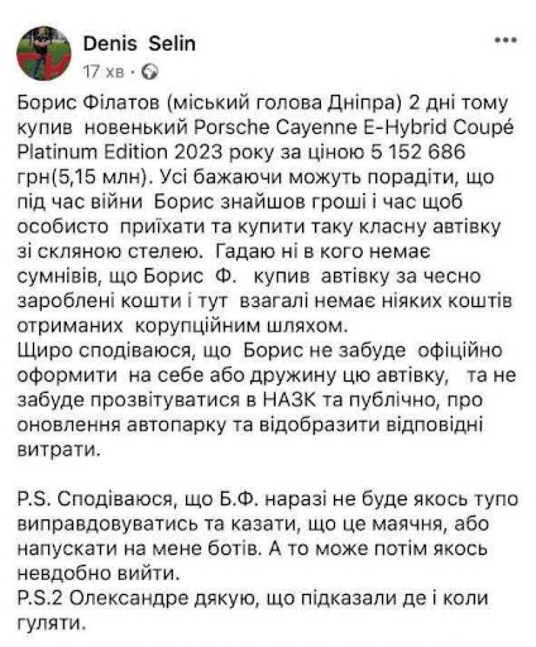 В публикации он заявил, что городской голова Днепра Борис Филатов якобы стал владельцем новенького Porsche Cayenne E-Hybrid Coupé Platinum Edition 2023-го года, цена которого превышает 5 миллионов гривен. К этому добавил комментарий, что Филатов, пока точатся боевые действия, якобы нашёл время и средства на такой роскошный автомобиль с панорамной крышей.