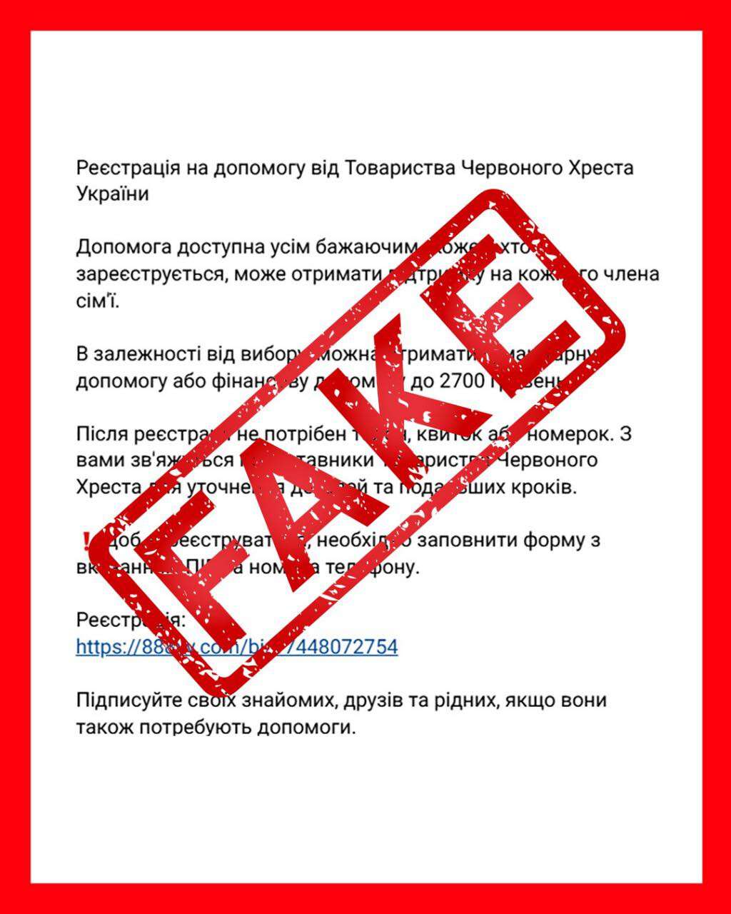 "Эта информация не соответствует действительности. Украинский Красный Крест не проводит регистрацию на финансовую помощь через сторонние сайты", - отметили в официальном заявлении.