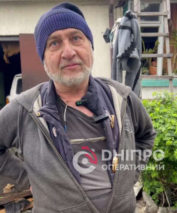 Жах. Що можна сказати? Такий, вибух. Нічого не зрозуміло — світло раптово потухло. Прилетів дрон. Будинок зруйновано. На дереві — дошки, рубероид, все прилетіло. Це з того будинку. Он там вибухнуло, і сюди прилетіло. Добре, що був кран на городі. Пригасив, принаймні, не дав далі горіти. Слава Богу, живий. Решта — переживемо.