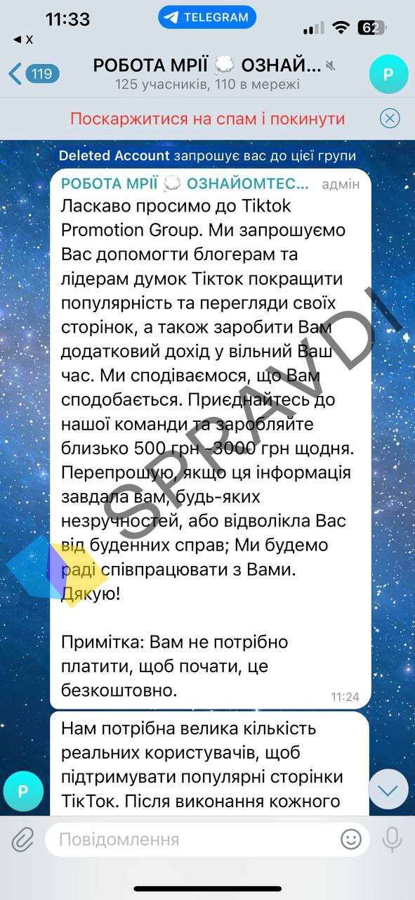 Днепрянам, которые ищут дополнительный заработок, в мессенджерах поступают привлекательные сообщения: мол, можно легко получать от 500 до 3000 грн ежедневно за активность в соцсетях. Мошенники нередко выдают себя за представителей известных компаний - например, Universal Pictures - и даже присылают «скриншоты выплат».