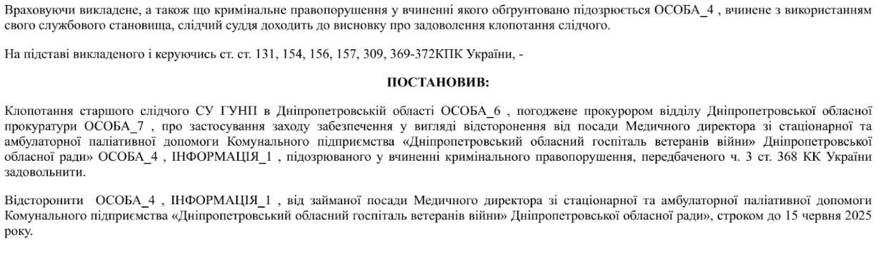«Следователи следственного управления ГУНП в Днепропетровской области выявили факт получения неправомерной выгоды и задержали 63-летнего директора одного из медицинских учреждений Днепра. В ходе досудебного расследования полицейские установили, что должностное лицо требовало от гражданина 32 тыс. гривен за беспрепятственное оформление на стационарное лечение… Расследование продолжается. Оперативное сопровождение осуществляют сотрудники СБУ, процессуальное руководство — Днепропетровская областная прокуратура», — говорилось в сообщении.