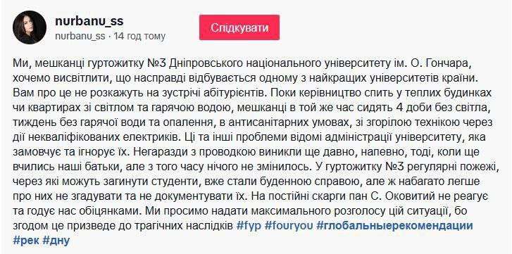Ещё в декабре 2024 года жильцы общежития публично обратились к руководству ДНУ, обвинив ректора Сергея Оковитого в бездействии. Лишь после огласки в соцсетях ситуация частично сдвинулась с мёртвой точки. Однако кардинальных изменений до сих пор нет.