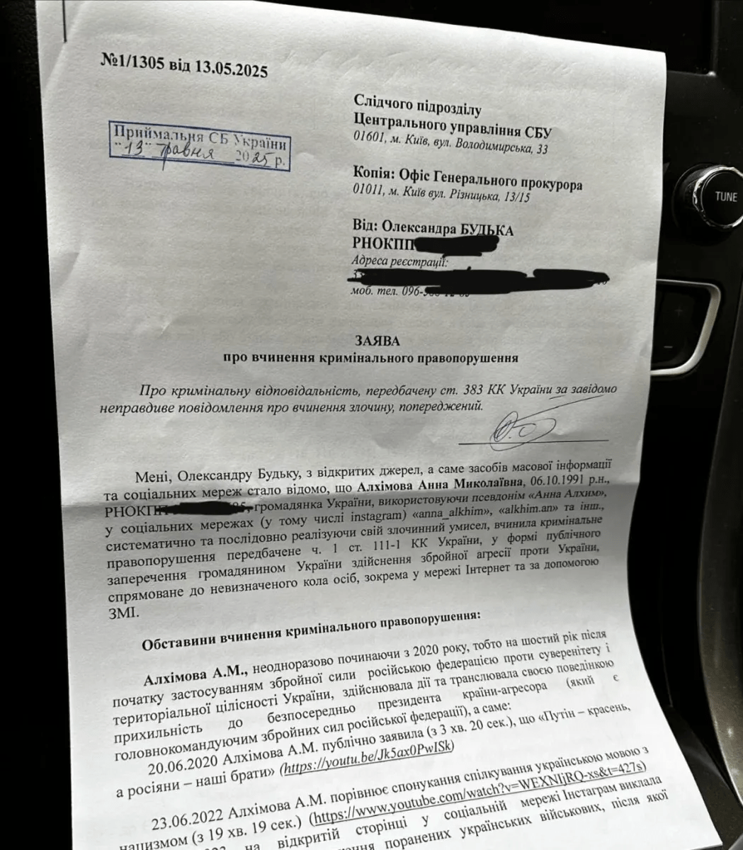 Заявление было подано 13 мая, о чем Александр сообщил на своей странице в соцсети Threads. В заметке он обнародовал соответствующие документы и отметил, что обвиняет Алхим в совершении уголовного преступления, предусмотренного частью 1 статьи 111-1 Уголовного кодекса Украины, что касается коллаборационной деятельности.
