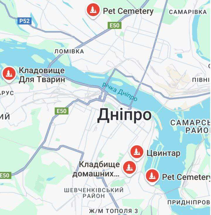 Зауважимо, що у місті є вісім кладовищ домашніх тварин, деякі з них навіть позначені на Google Maps. Люди роками приходять туди, аби згадати своїх пухнастих друзів, приносять квіти, прикрашають могилки. Найбільші з них розташовані на ж/м Перемога, Червоний Камінь та Тополя. На лівому березі позначений один такий цвинтар – на проспекті Миру, поруч з ж/м Лівобережний-3: